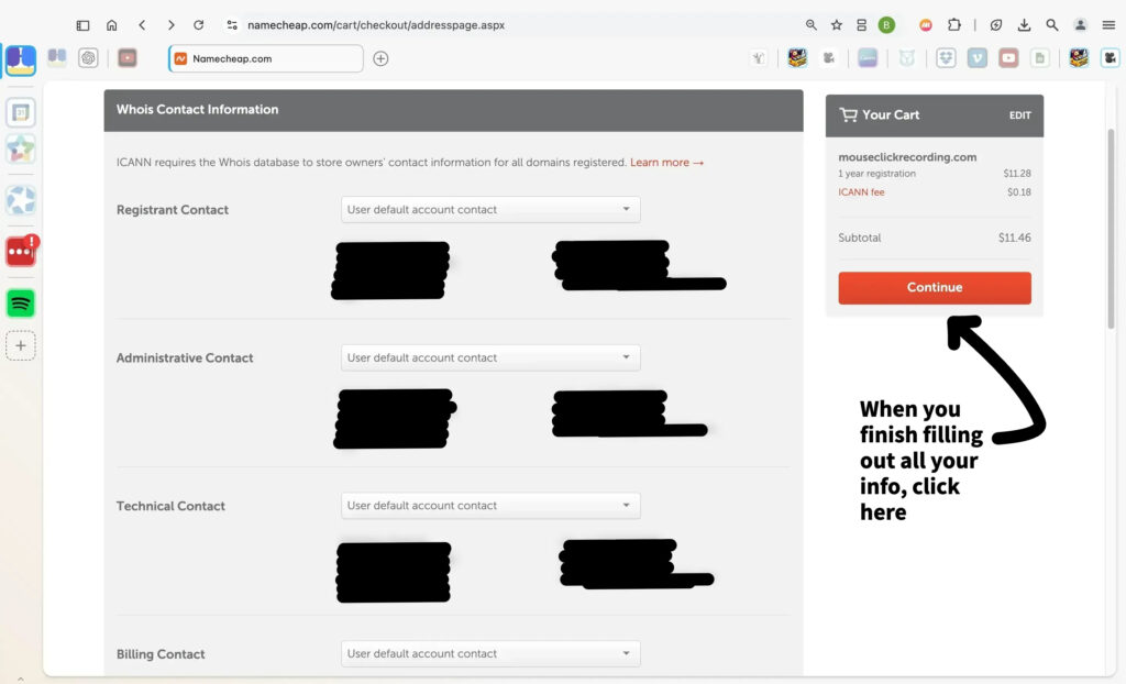 ICANN requires contact information to be stored in the Whois database for all registered domains. Review the Registrant, Administrative, Technical, and Billing contact sections. You can use the default account information provided or update these fields if needed.