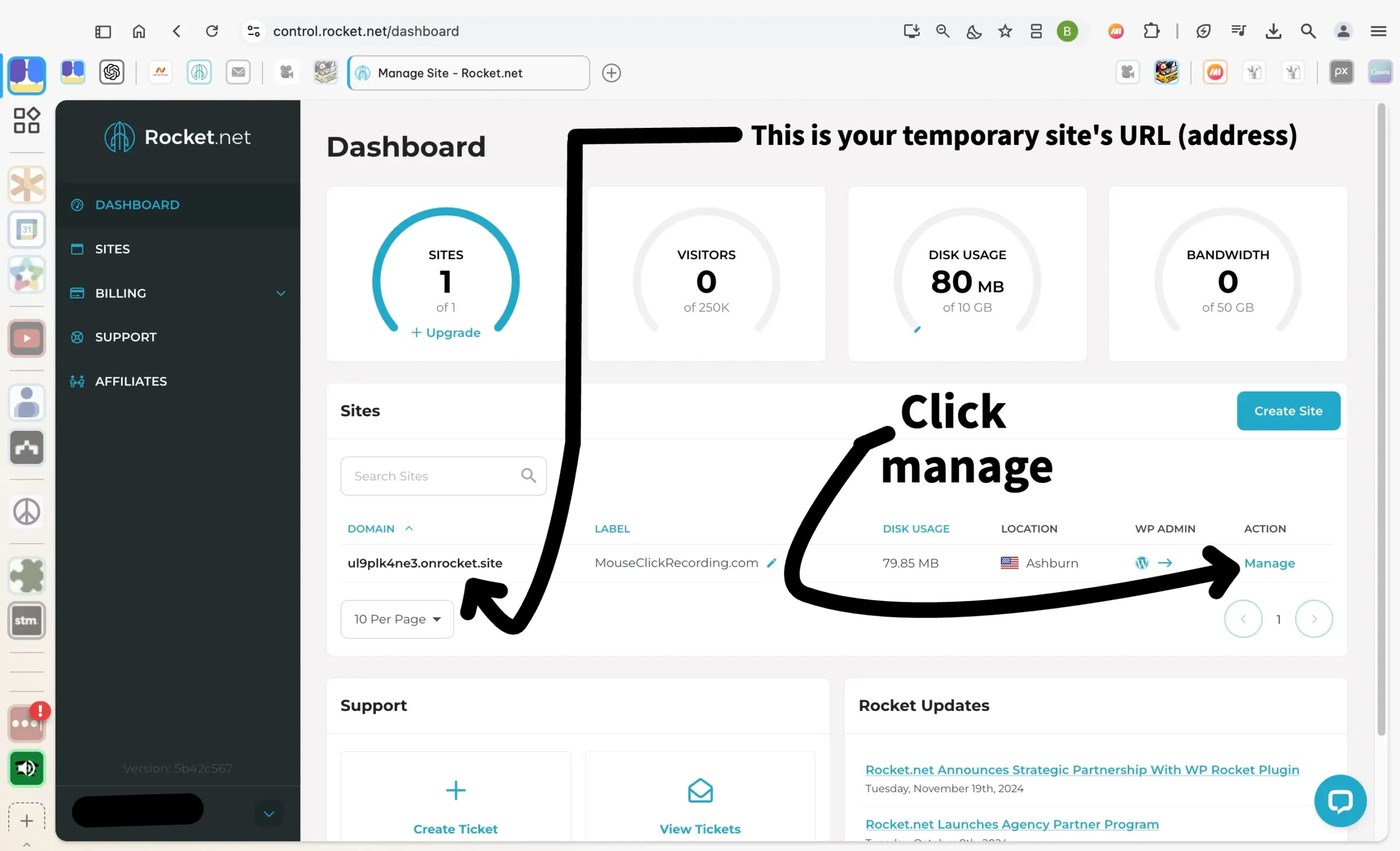 Once your temporary site is set up, you’ll see it listed in the Dashboard under the “Sites” section. The temporary URL for your site is displayed here, and this will be its address until you connect your custom domain.