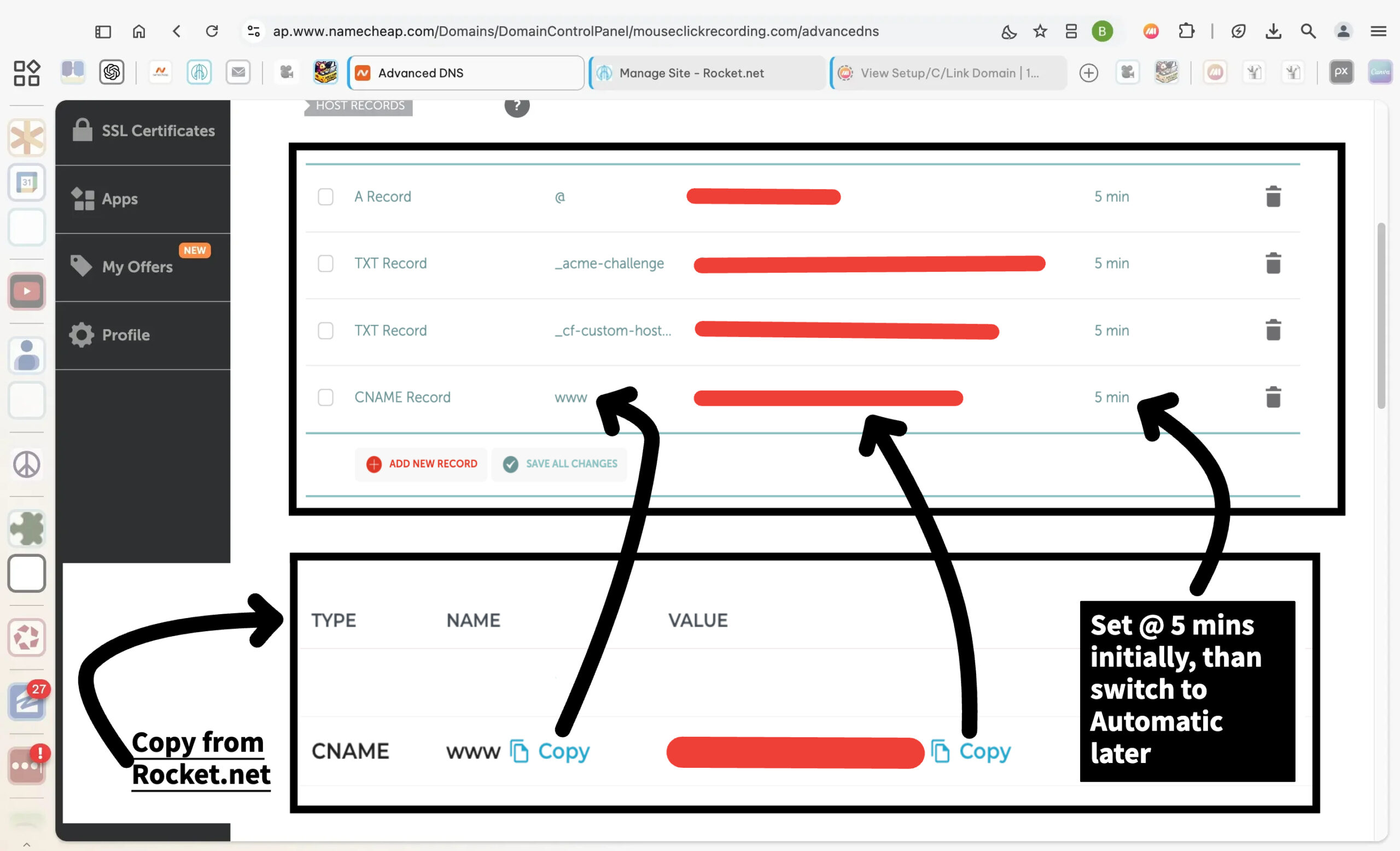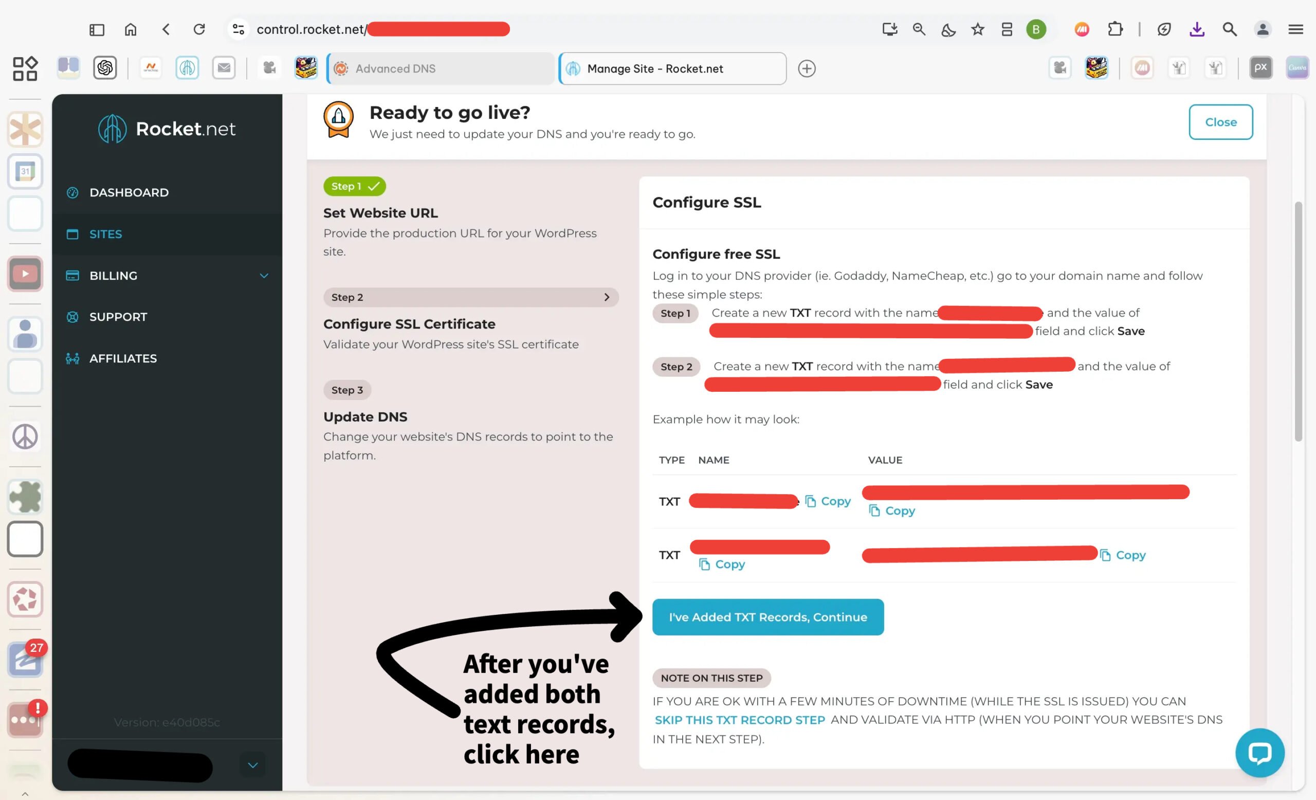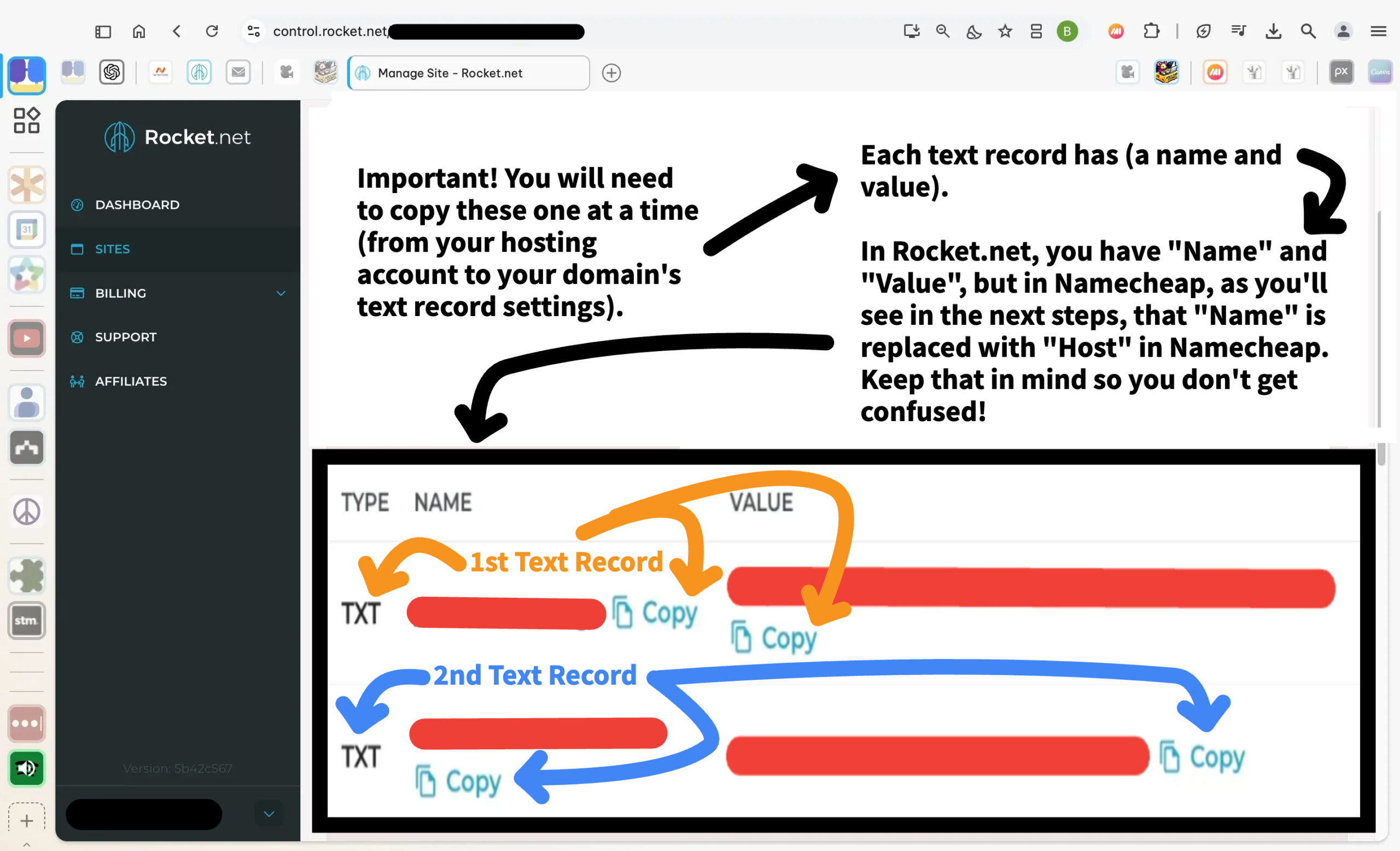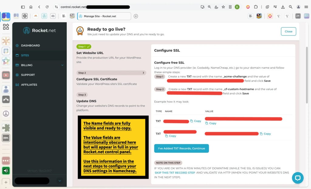 This step provides the details you’ll use in the upcoming steps to link your domain with your hosting account. In the Rocket.net control panel, the Name fields are fully visible, while the Value fields will display in your account to ensure accuracy.