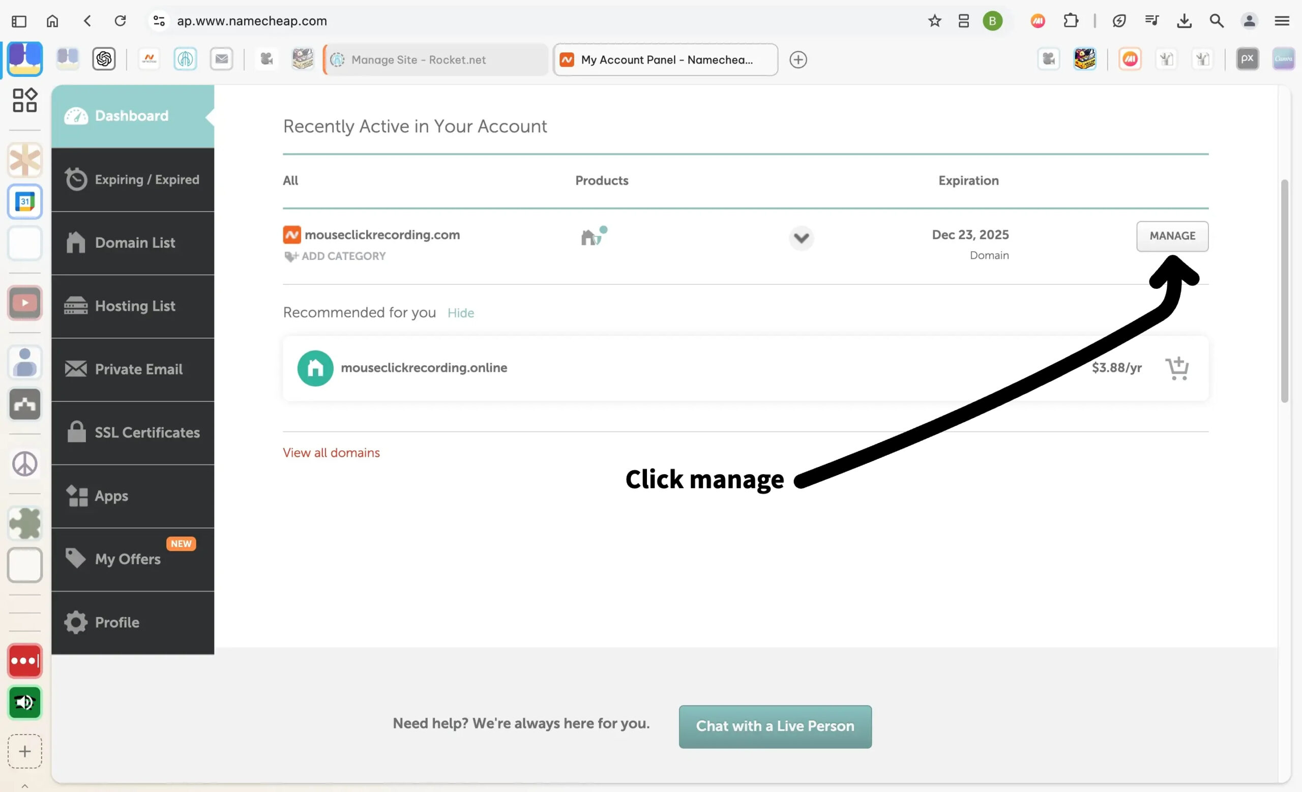 - From the dashboard, locate the domain you want to manage under the “Recently Active in Your Account” section.