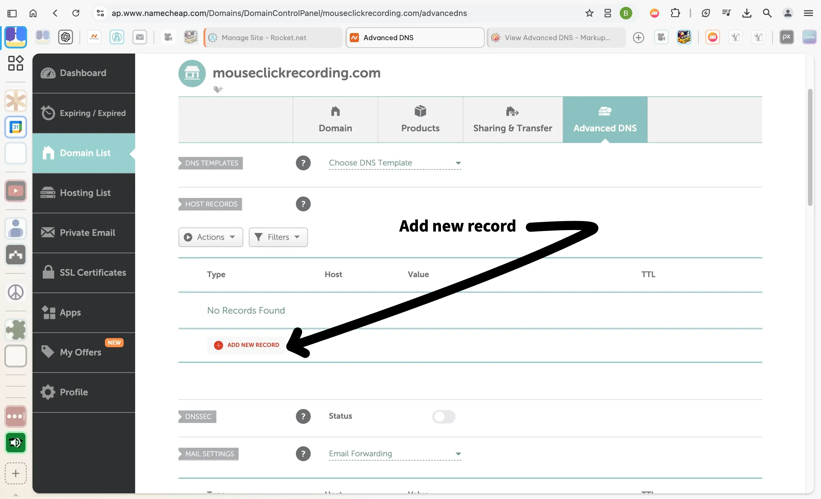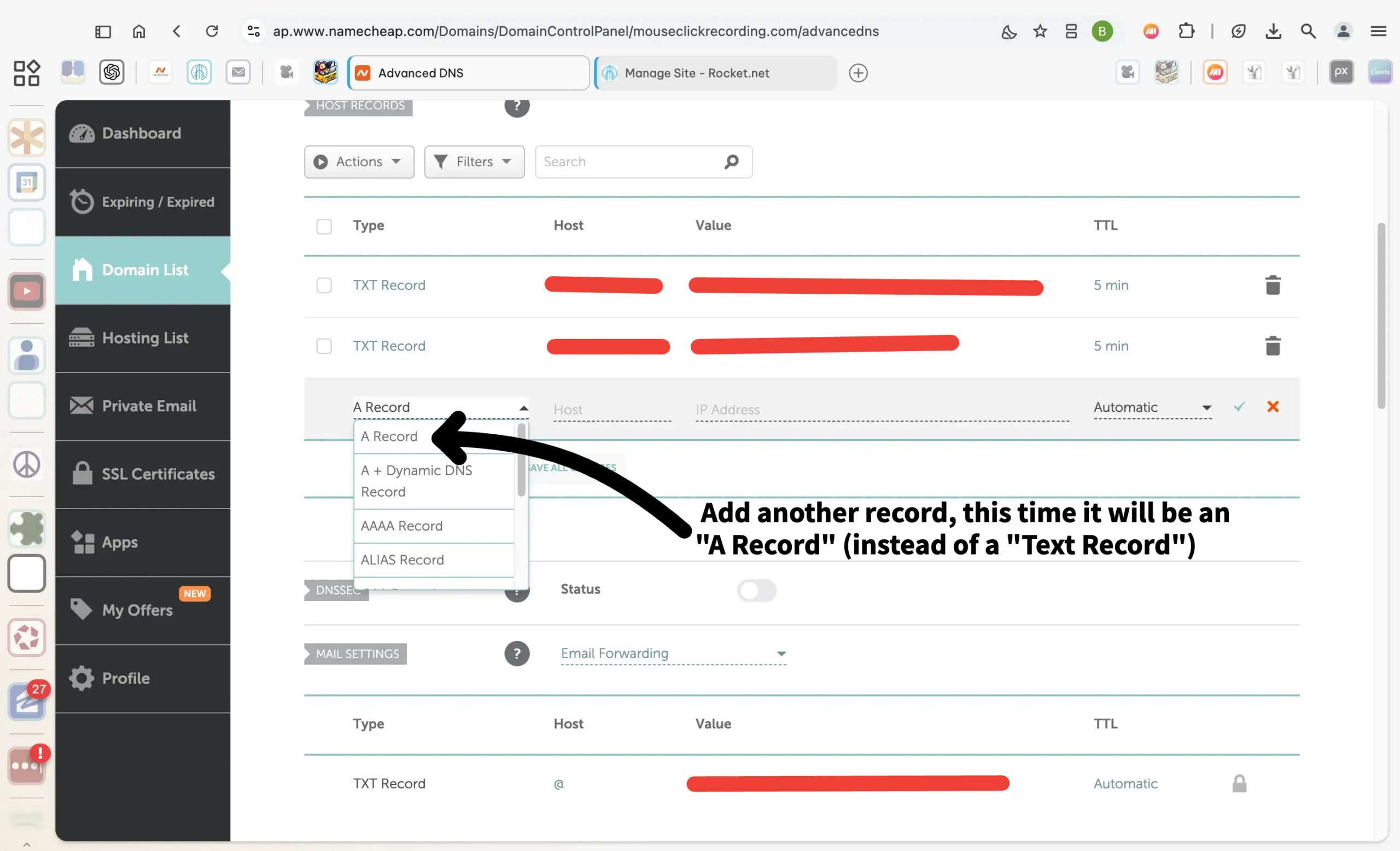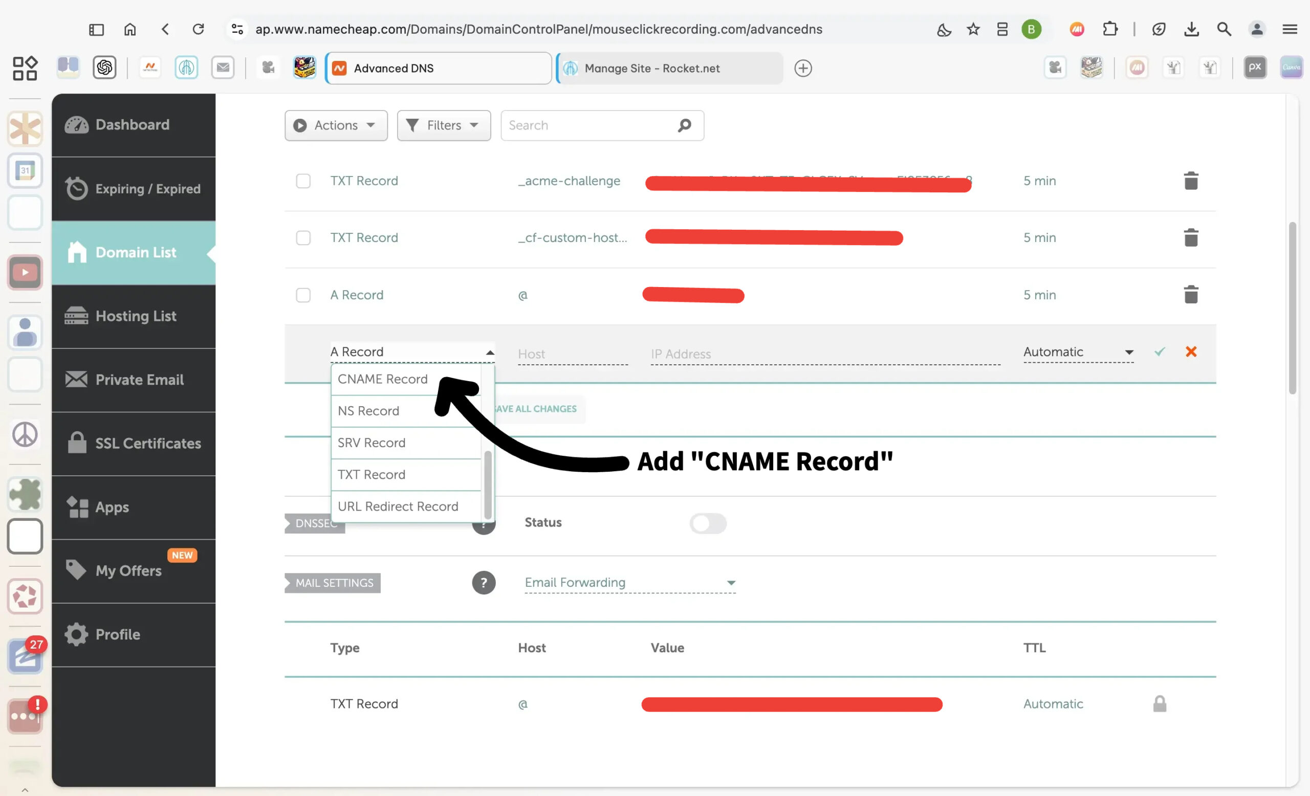 - Add the New Record Anyway: Use the Add New Record option to enter the details provided by Rocket.net.