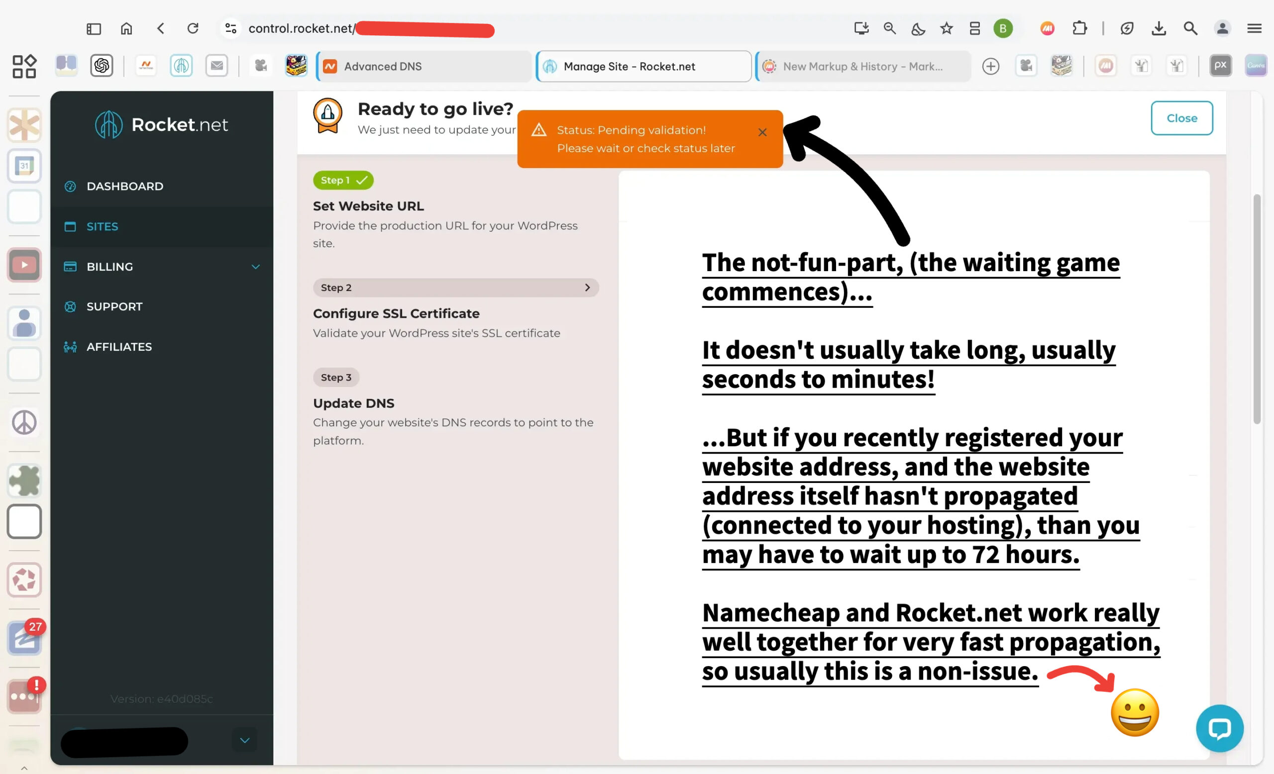 After adding your TXT records, validation starts, and the good news is that both Namecheap and Rocket.net work together seamlessly for a fast setup.