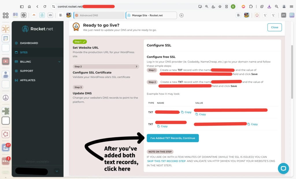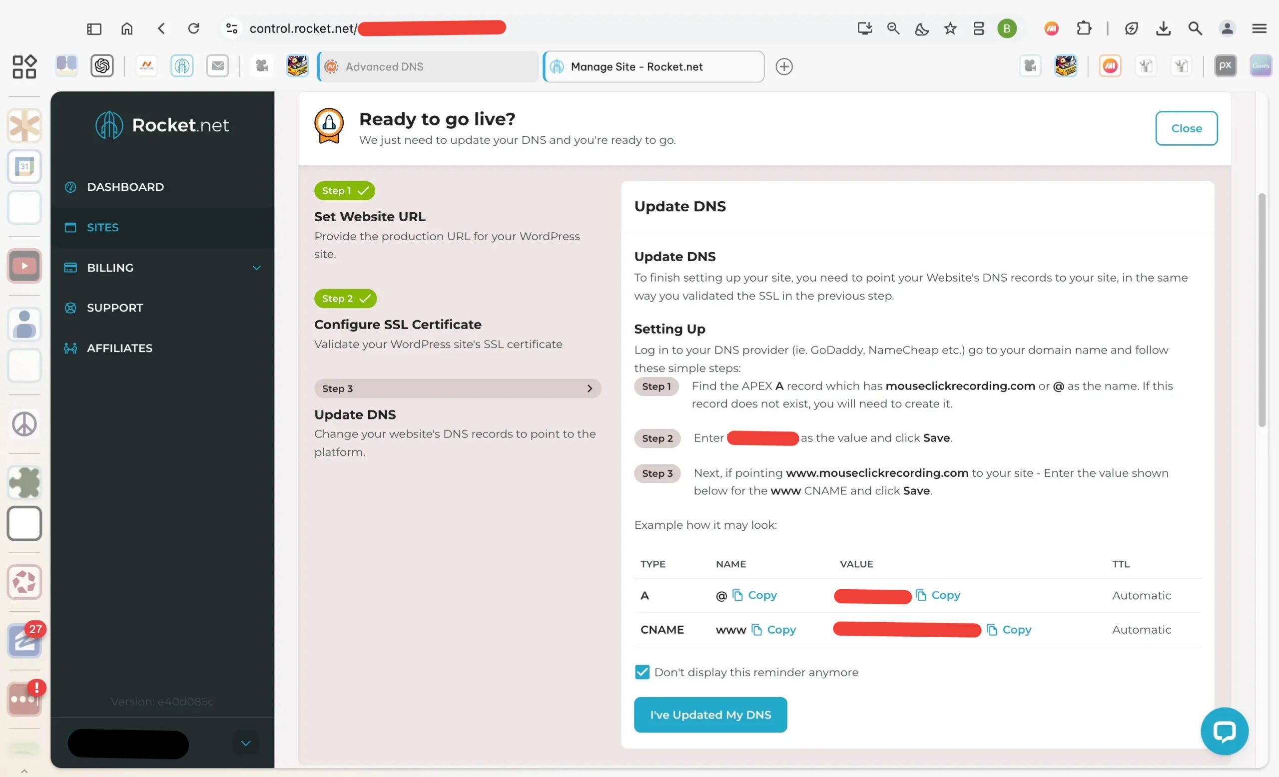 After adding both the A and CNAME records in your DNS provider, return to Rocket.net and click the blue button to confirm.