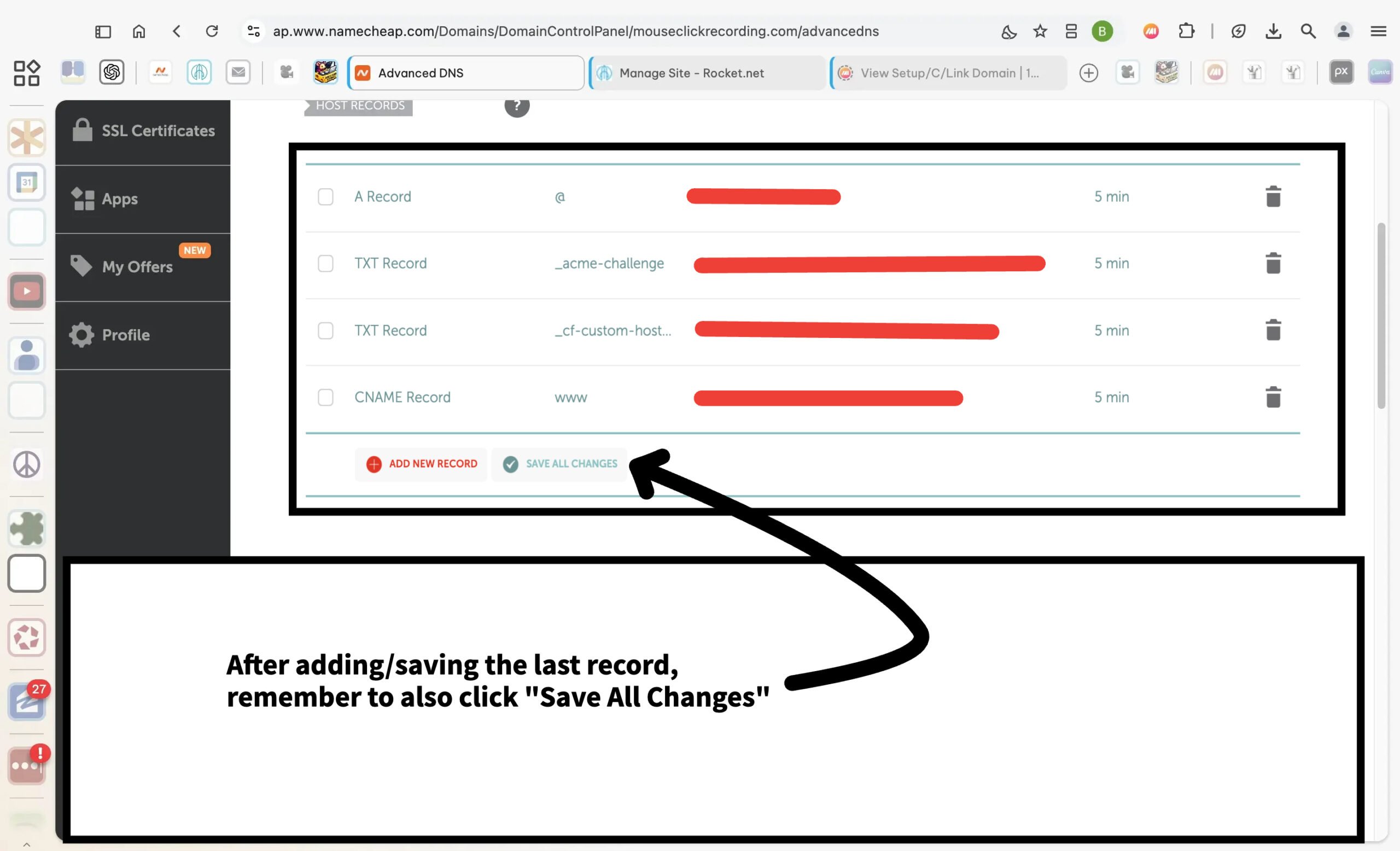 Adding the new record first is recommended if deleting an existing record is not immediately possible. This method avoids delays and ensures Rocket.net’s setup instructions are followed accurately.