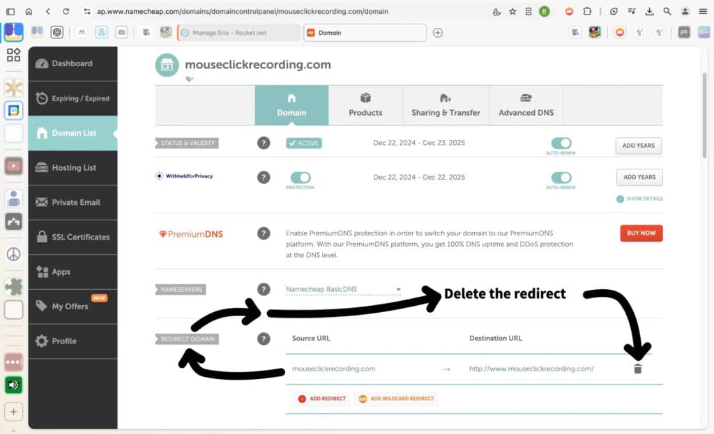 If a record cannot be deleted due to restrictions, such as being “blocked by domain redirect,” consider the following approaches: