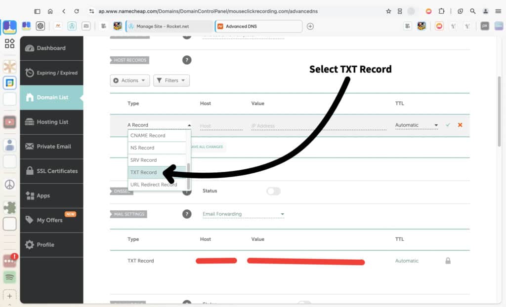 Click on the drop-down menu under the “Type” column, as shown in the screenshot. From the list of options, select TXT Record. This is necessary for adding a TXT record to your domain’s DNS settings, which is often used for domain verification or to set up services like email authentication. Selecting the correct record type ensures your domain is configured properly for the task you’re setting up.