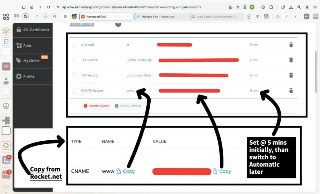 Copy the details provided by Rocket.net into the corresponding fields on your DNS settings: