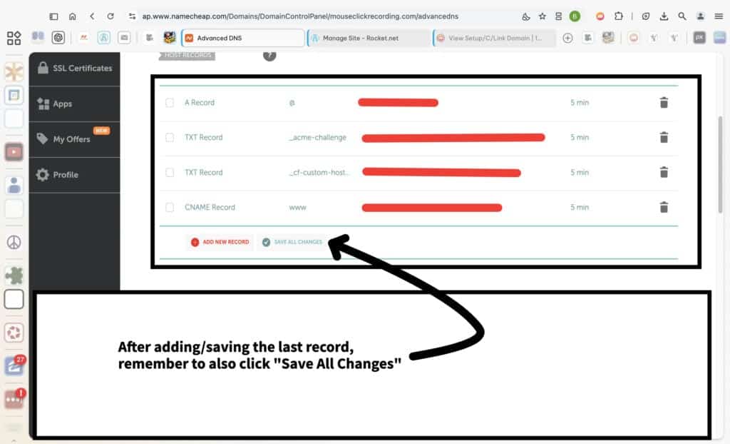 Click the trash icon next to any unwanted records to delete them. Starting fresh typically ensures a clean slate for adding the records provided by Rocket.net.