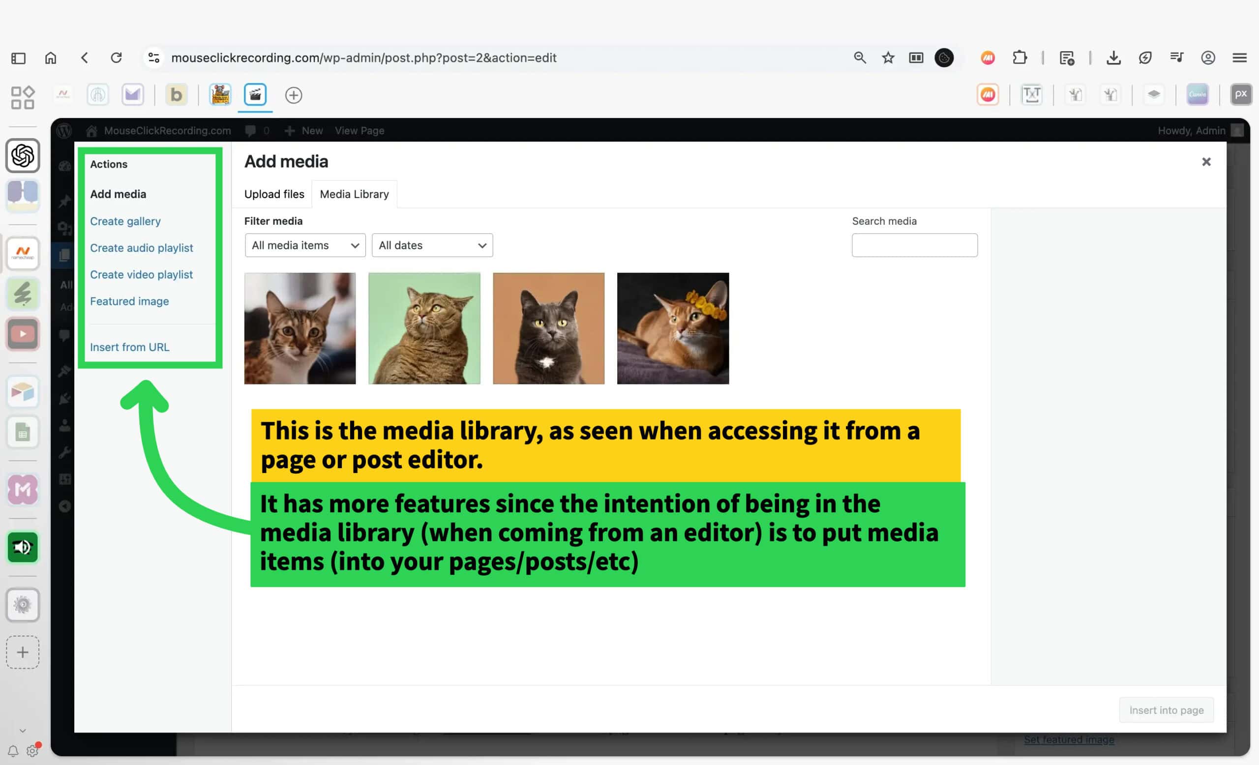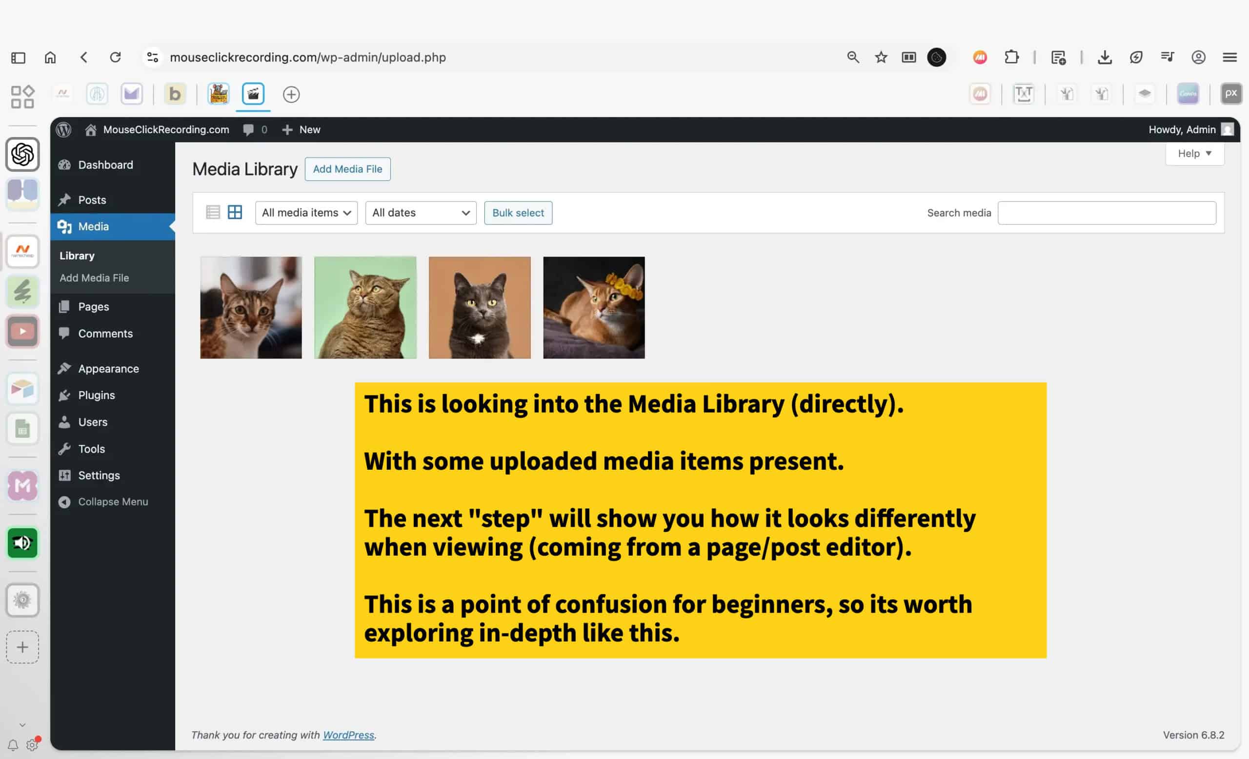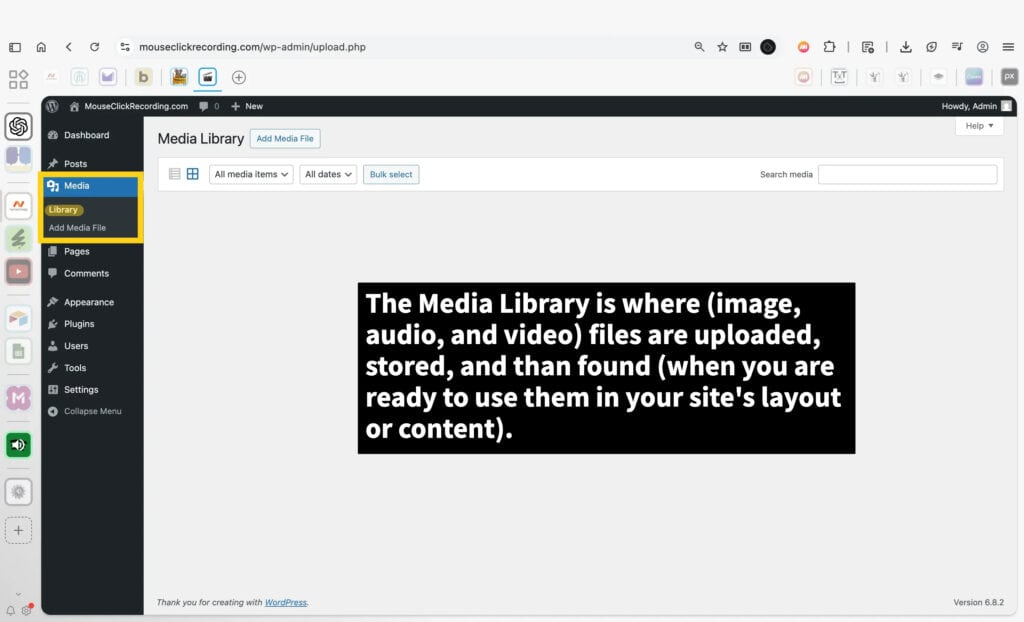 Media is the library for everything uploaded: images, video, audio, and documents. Each item stored here can be reused across the site. A clean, optimized media library keeps your site fast and organized while giving you a central place to manage assets.