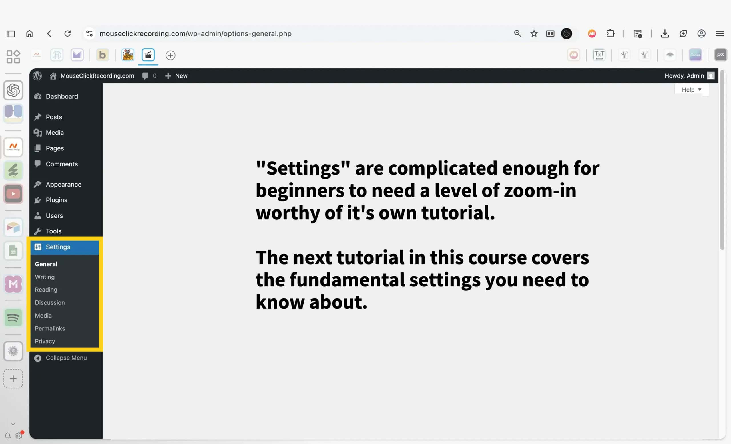 Settings governs global behavior. Site title and tagline, timezone and formats, homepage display preferences, and reading defaults all live here. Plugins often add their own configuration panels under Settings. These options establish the baseline rules for how the site operates.