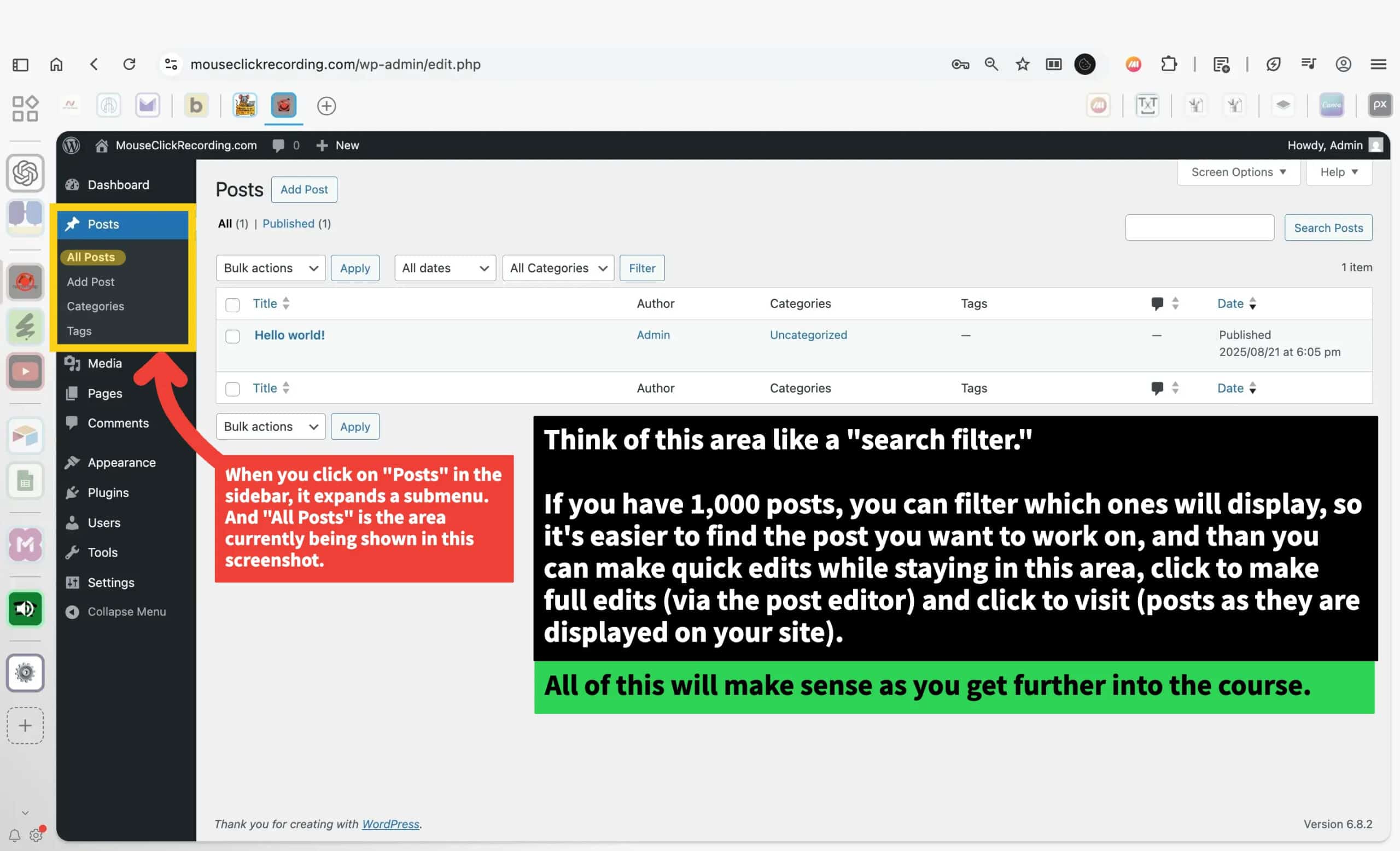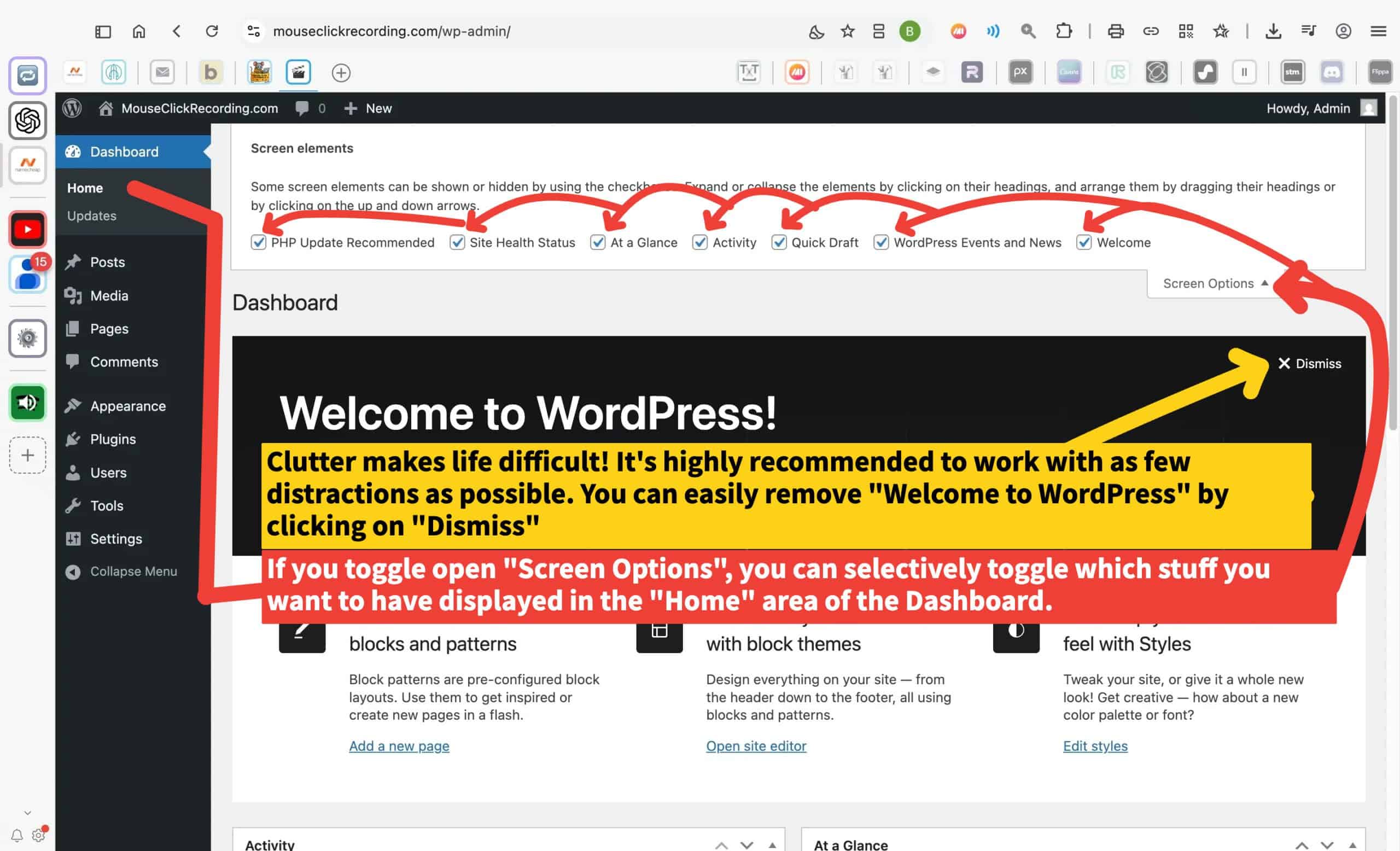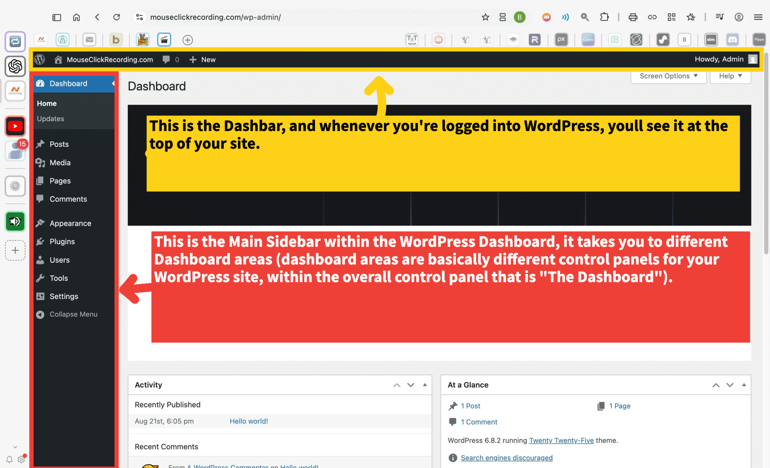 The Dashboard is the administrative back end of your site. It’s what you see whenever you’re logged in and building the site rather than just viewing it. Every major function is accessed from here.