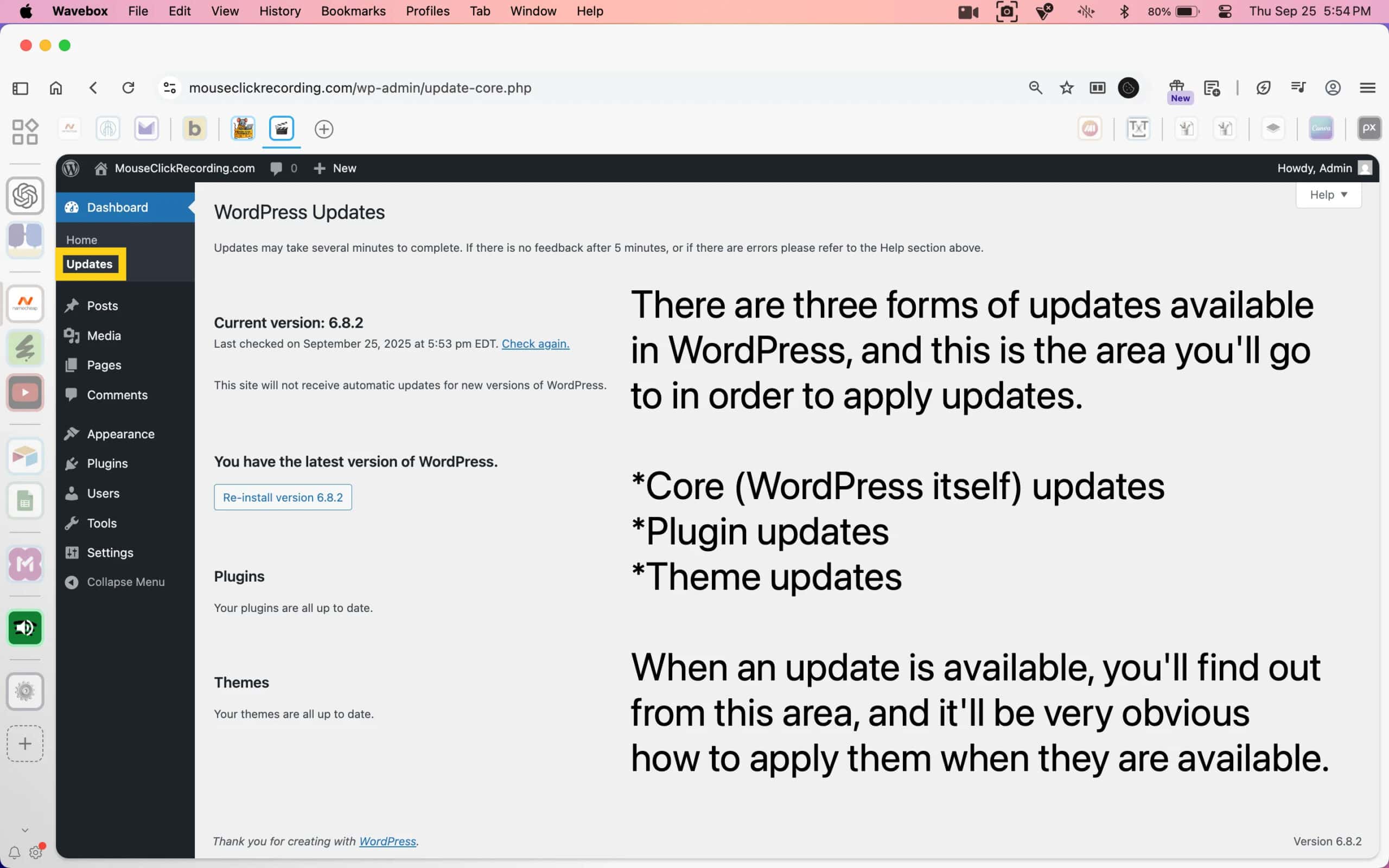 The Home screen is the landing point after login, with quick links and shortcuts. Updates is where you maintain WordPress, themes, and plugins.