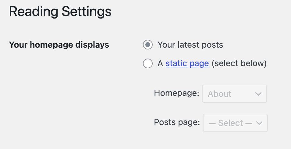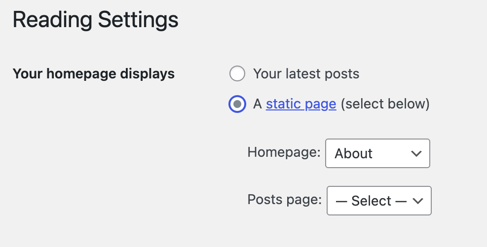 For you, since no page exists at this point in the course, the option to set a static page as the homepage isn’t visible in this step. Once pages are created later, you can choose within Settings → Reading whether to use a static page or the default blog feed.