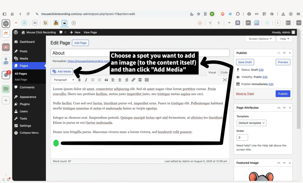 Click into the content where you want the image to appear, then click Add Media above the toolbar.