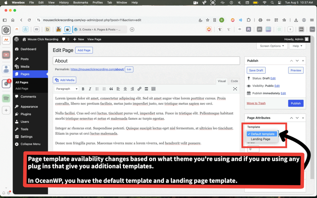 The Template dropdown is in the Page Attributes section on the right.