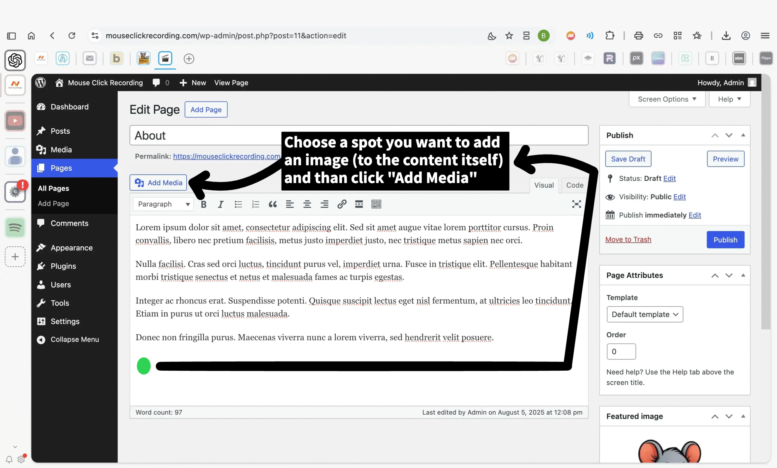 Click into the content where you want the image to appear, then click Add Media above the toolbar.