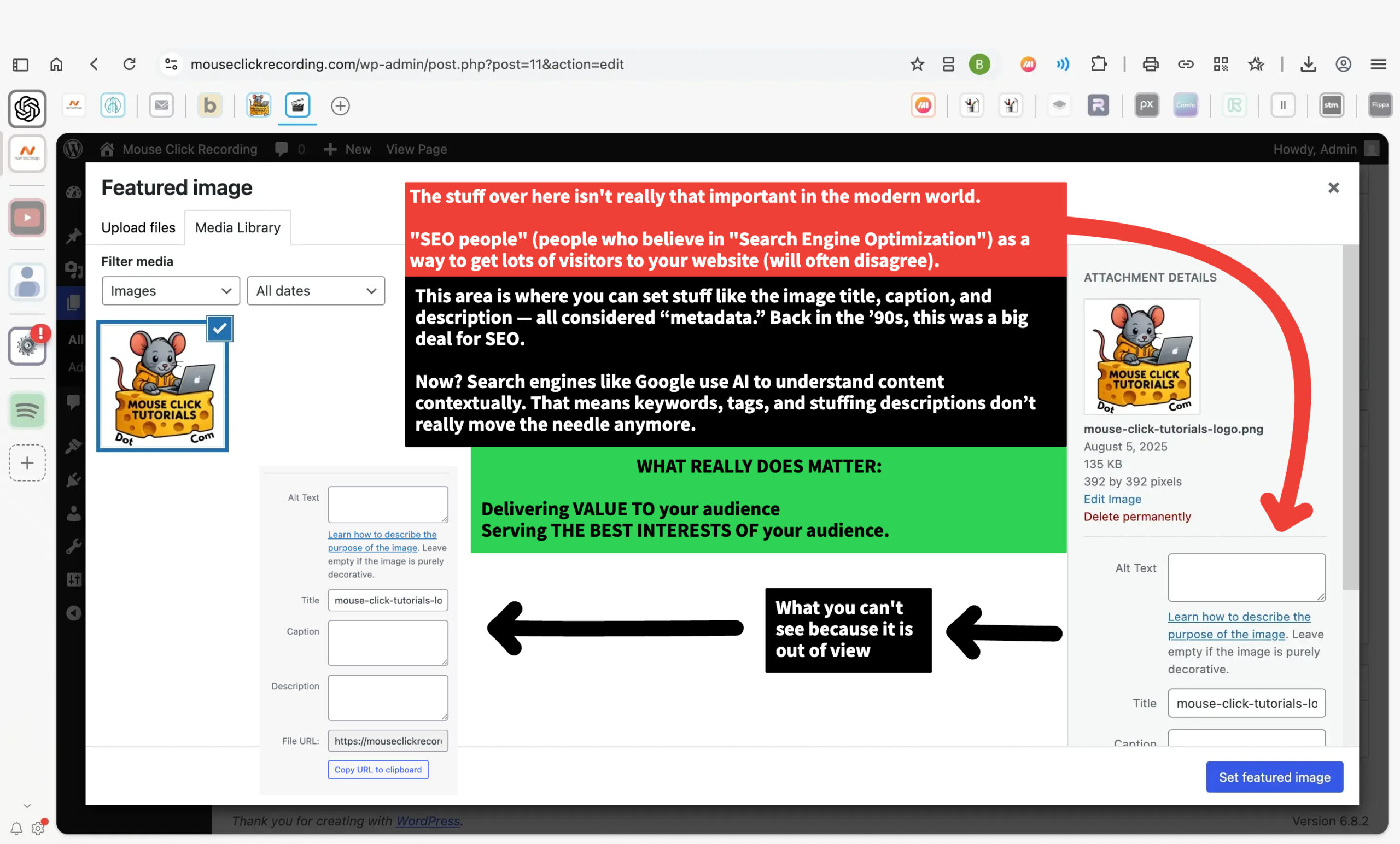 You don’t need to worry much about these — they used to matter more for SEO, but today they aren’t that important on a website. On a content platform (such as YouTube), it’s a different story, but (on your website), your time is better spent focusing on creating value and looking out for your audience (than seeking to “rank in search engines” from (the diminishing returns you get in putting your valuable time into optimizing your keywords and titles and descriptions within WordPress).