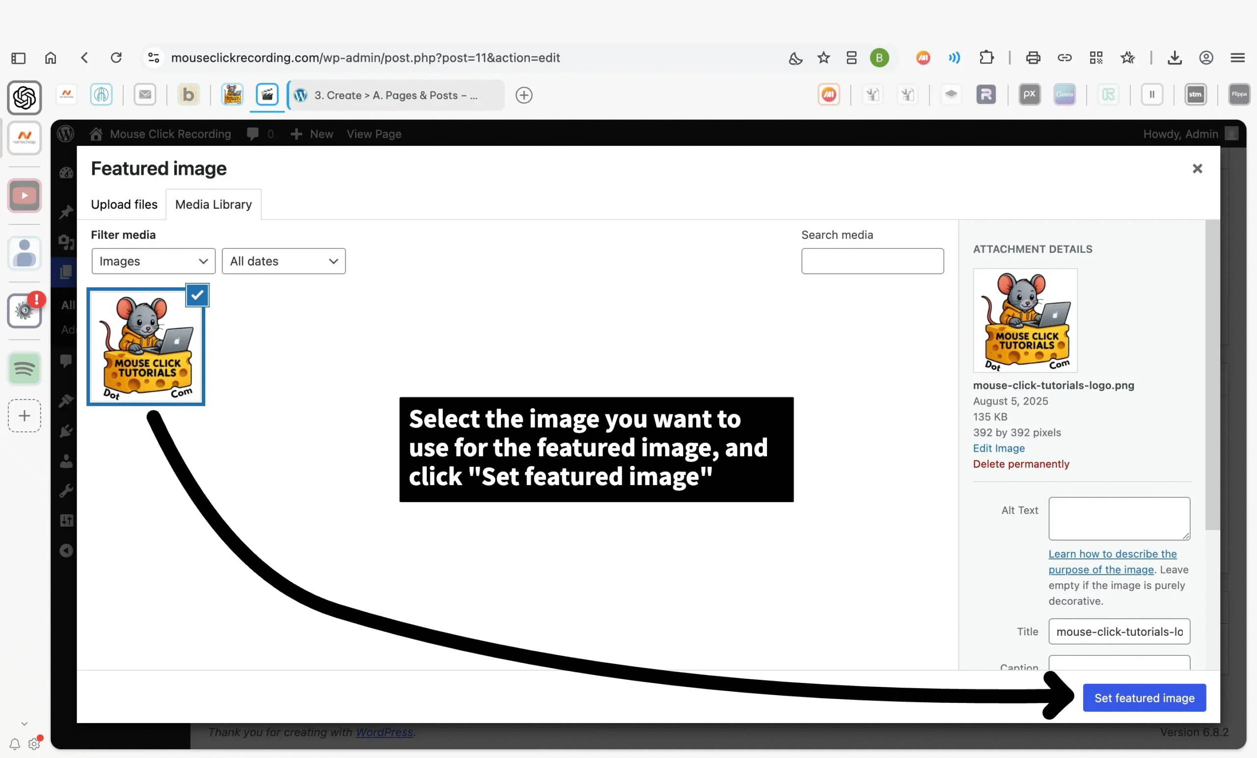 Click Set featured image to confirm your selection and attach the image to the page.