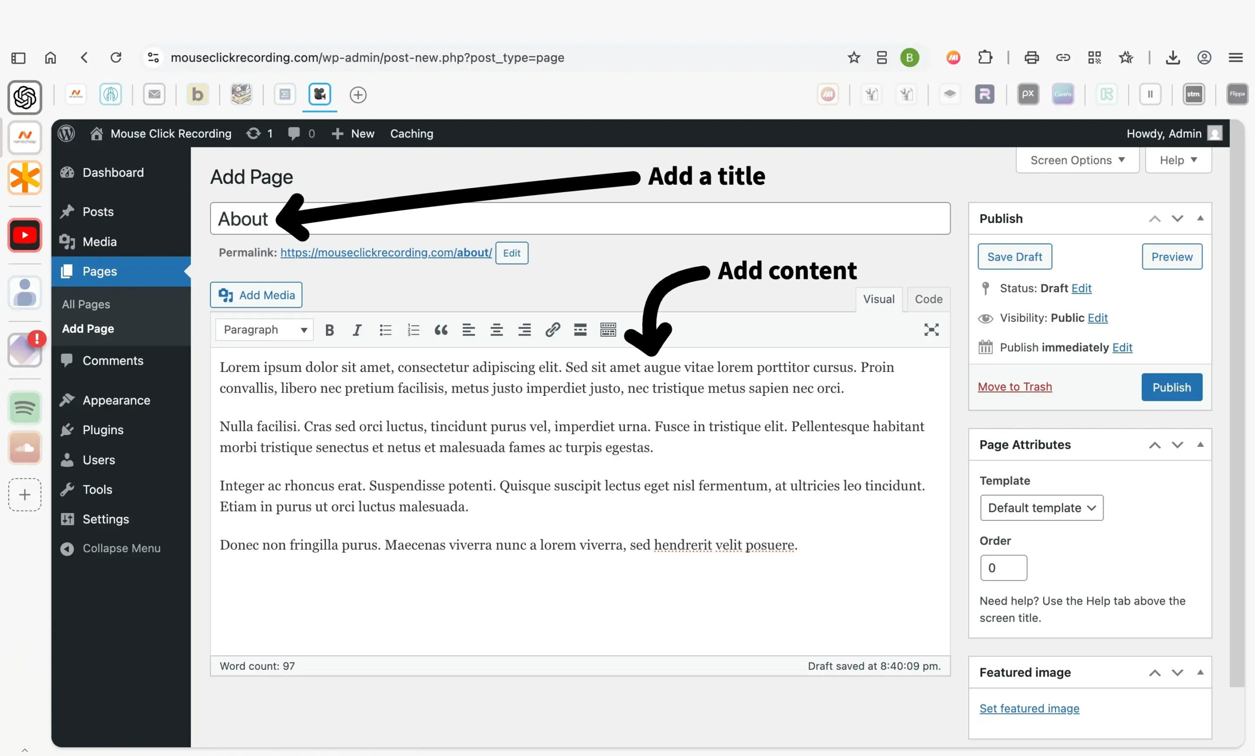 Type your page title at the top — like “About.” Below that is the content area where your actual text will go. The text shown here is just example filler used for this tutorial.